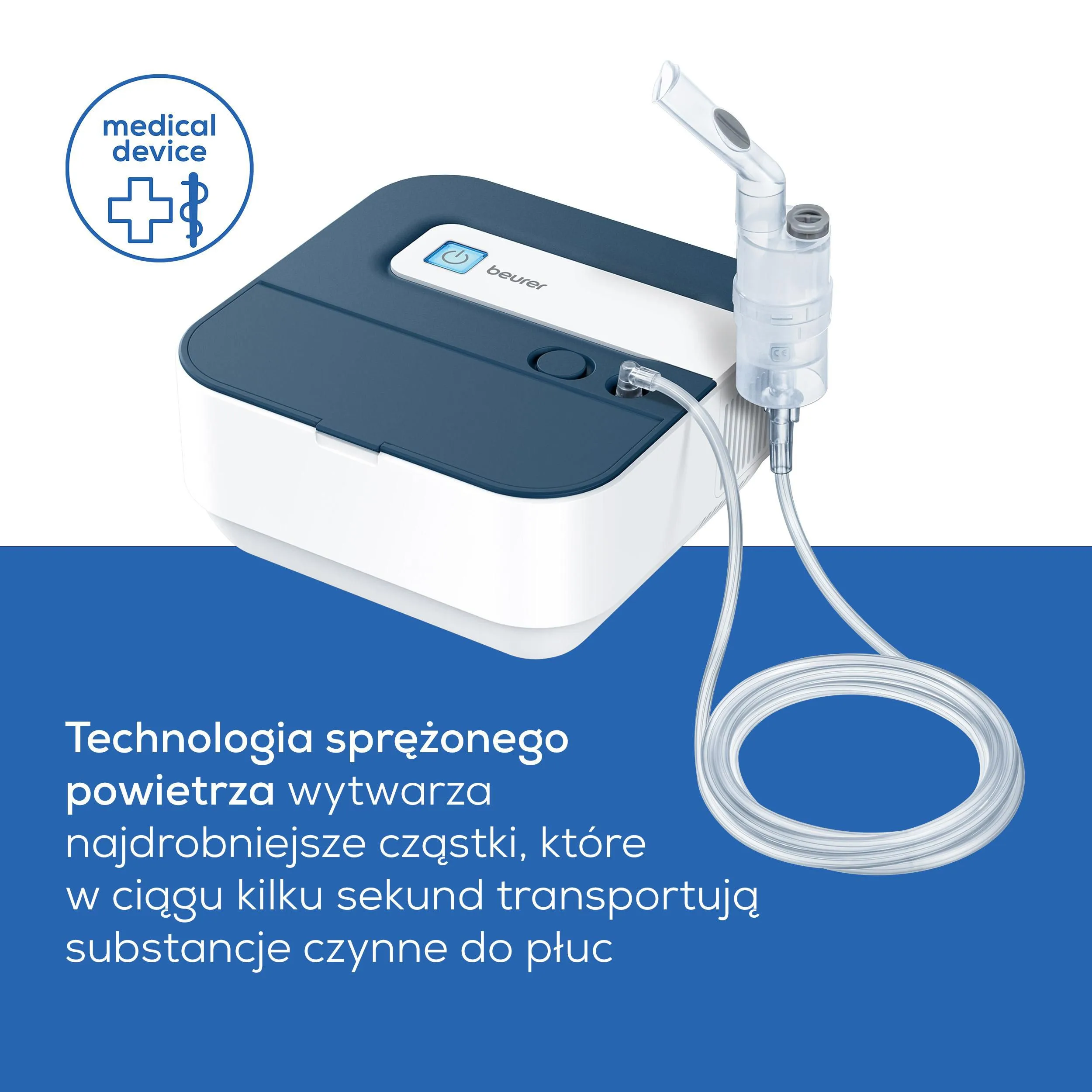 - Technologia sprężonego powietrza AC – wysoka wydajność nebulizacji i skrócony czas terapii