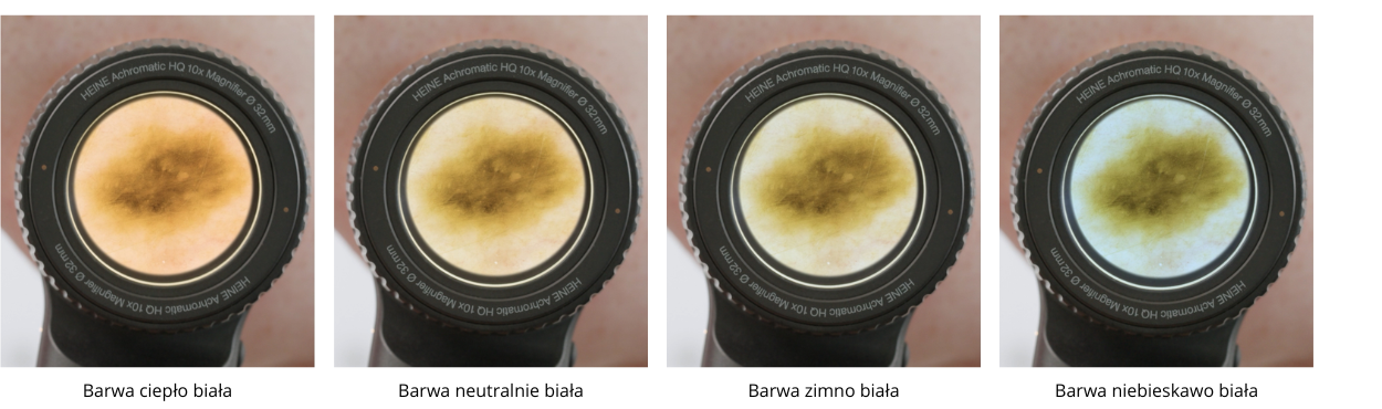 - Dostosowanie barwy światła do preferencji użytkownika lub specyfiki badanej zmiany.