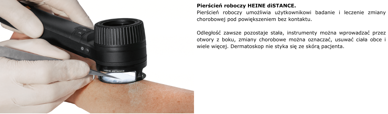 Kiedy wskazane jest badanie w trybie bezkontaktowym?Podczas badania klinicznego miejsc trudno dostępnych (np. między palcami stóp lub palców), gdzie bezpośredni kontakt ze zmianą jest utrudniony, a także w rzadkich przypadkach klinicznych zagrożonych infekcją, można zalecić stosowanie głowicy HEINE DELTA 30 oraz DELTAone bez zamontowanej płytki stykowej – w trybie bezdotykowym. Daje to lepszą wizualizację trudno dostępnych zmian, a także możliwość prawidłowej obserwacji zmian infekcyjnych bez bezpośredniego kontaktu ze skórą. Płytkę do miejsc trudno dostępnych można dokupić pod linkiem - > Sprawdź
