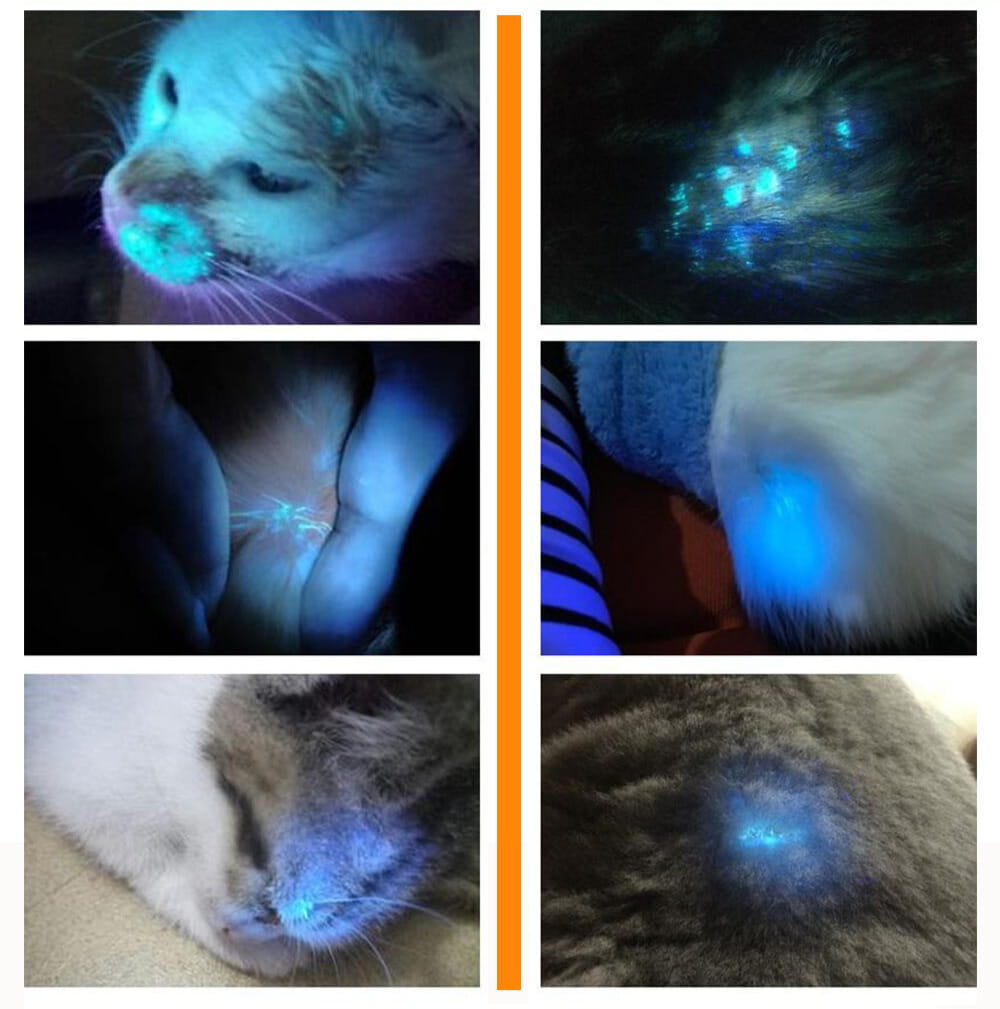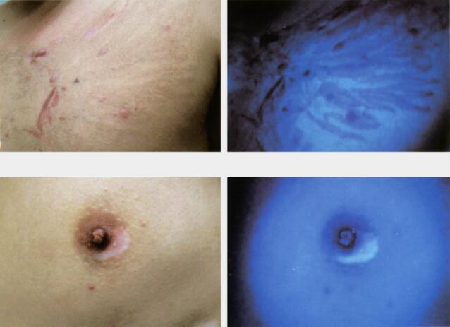 - Badanie fluorescencyjne – zmiany skórne widoczne w charakterystycznych barwach.