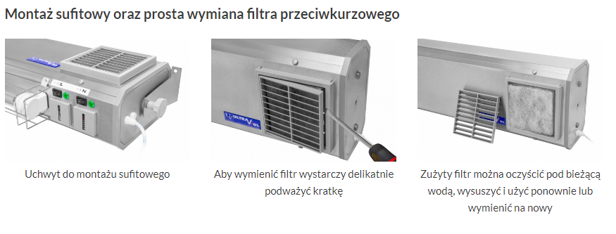 - rodzaj obudowy: blacha kwasoodporna, łatwość dezynfekcji i mycia lampy, szczelność, pełne bezpieczeństwo personelu, prostota wymiany filtrów powietrza bez użycia narzędzi,