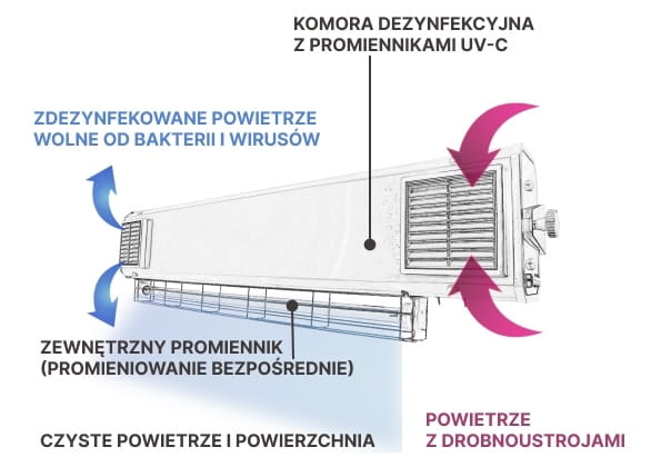 *Promieniowanie UV-C nieodwracalnie dezaktywuje bakterie, wirusy, pleśnie, grzyby oraz wszelkie inne drobnoustroje gdy tylko powyższe znajdują się w zasięgu promieni emitowanych przez lampy bezpośredniego działania i w komorze dezynfekcyjnej w przypadku lamp przepływowych z wymuszonym obiegiem powietrza.