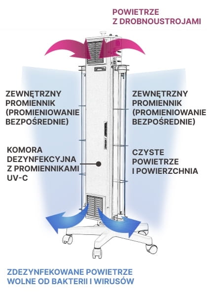 Dzięki dwufunkcyjności tego modelu, możesz korzystać z dwóch różnych trybów pracy. Funkcja I umożliwia przepływową dezynfekcję powietrza w obecności ludzi, co zapewnia czyste i bezpieczne środowisko nawet podczas codziennej aktywności. Funkcja II natomiast pozwala na naświetlanie powietrza i powierzchni bezpośrednim działaniem UV-C podczas nieobecności osób w pomieszczeniu.