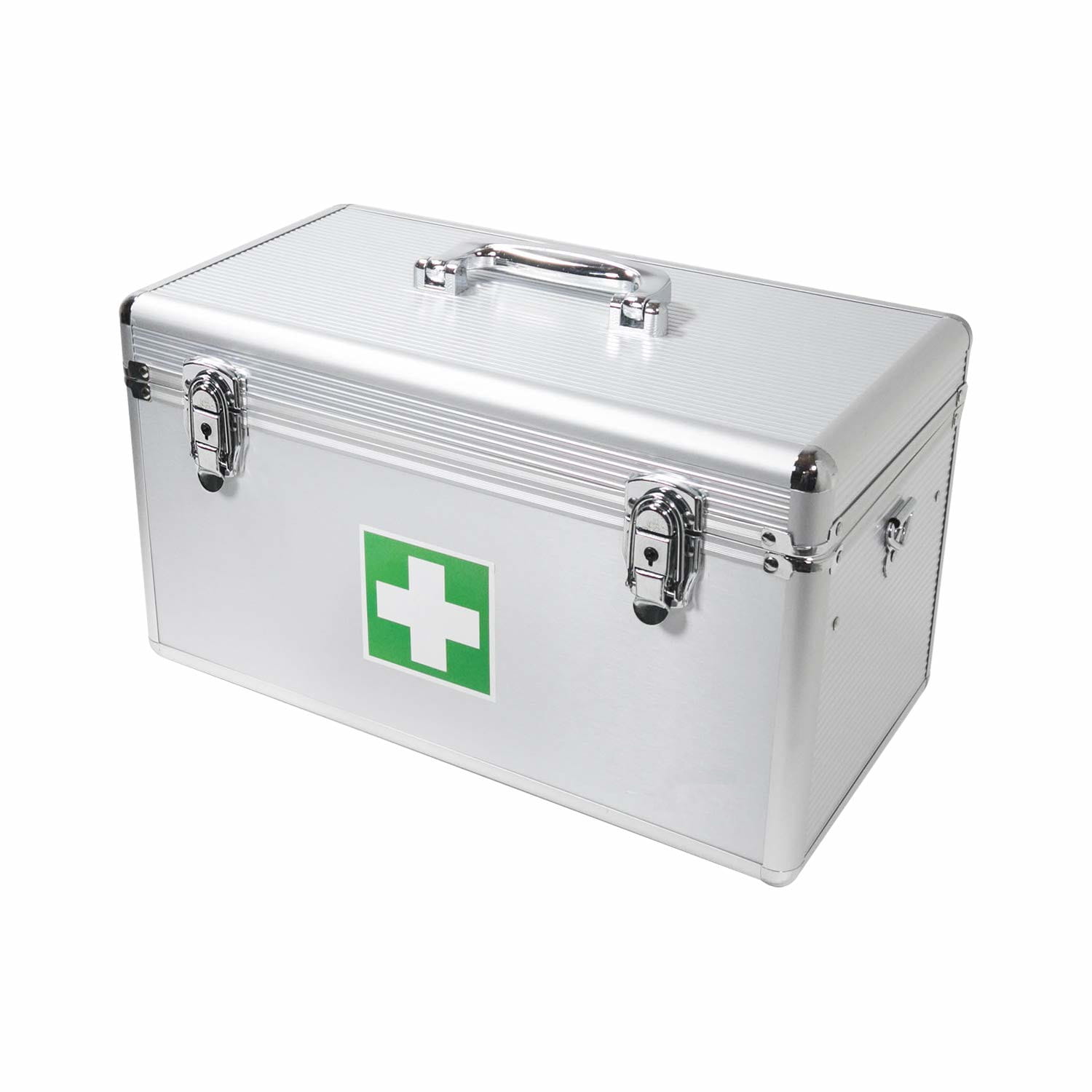 Apteczka pierwszej pomocy wyposażona typu skrzynka to bezpieczeństwo dzięki solidnej konstrukcji. Odporna na wstrząsy zaokrąglone rogi i wzmocniona aluminiowa rama zapewniają wysoką stabilność i najlepszą ochronę sprzętu pierwszej pomocy. Szafka jest wyposażona w 4 przegrody: wyjmowana wkładka z 3 przegrodami na małe przedmioty, takie jak bandaże z gazy, strzykawki i inne, oraz druga duża przegroda pod wkładką na duże przedmioty, takie jak leki, spray chłodzący, materiały opatrunkowe i wiele innych.