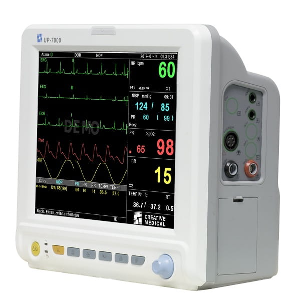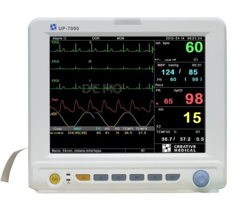 Kardiomonitor UP-7000 to zaawansowane urządzenie służące do monitorowania i nadzoru podstawowych funkcji życiowych pacjentów, dostosowane zarówno do dorosłych, dzieci, jak i niemowląt. Pozwala on na precyzyjne monitorowanie i rejestrację różnych parametrów, takich jak EKG, częstotliwość oddechów (RR), nasycenie krwi tlenem (SpO2), nieinwazyjny pomiar ciśnienia krwi (NIBP), temperatura (TEMP) oraz puls (PR).