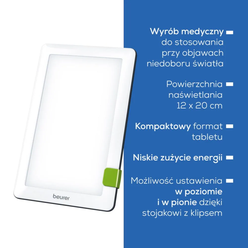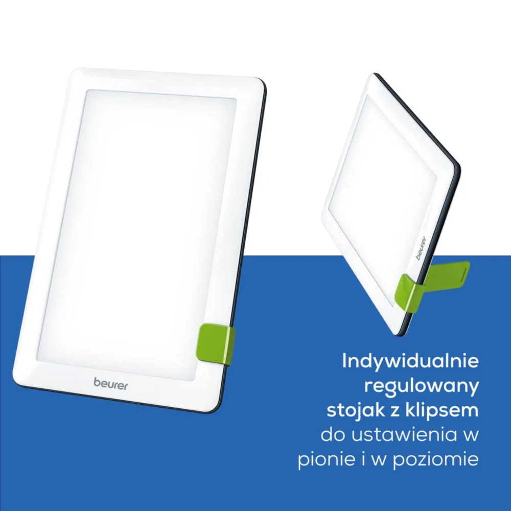 Beurer TL 30 to poręczna lampa o świetle dziennym zaprojektowana, aby poprawiać samopoczucie i koncentrację, gdy brakuje naturalnego słońca. Emituje do 10 000 luksów (przy ok. 10 cm), nie emituje promieni UV i dzięki technologii LED zapewnia równomierne, niemigoczące oświetlenie. Smukła forma i regulowany stojak pozwalają używać lampy pionowo lub poziomo – na biurku, w domu i w podróży.