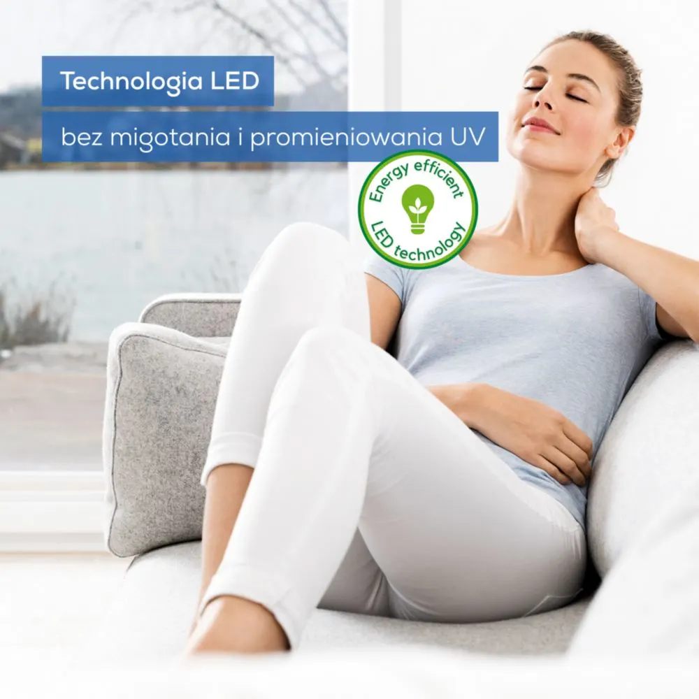 - Naturalny efekt światła dziennego – do 10 000 lx dla lepszego nastroju i energii.