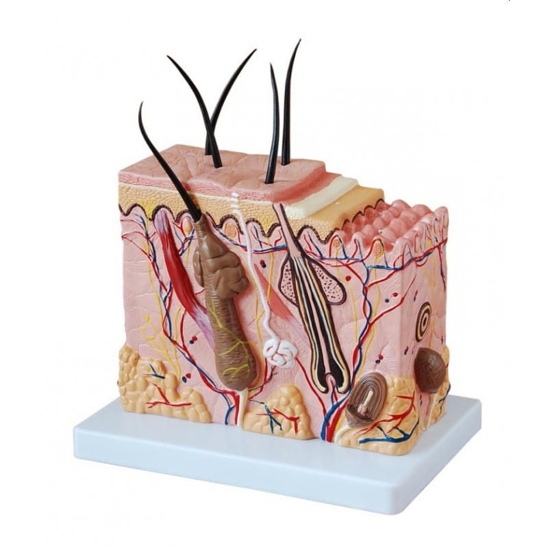 Zamontowany model skóry człowieka został na białej plastikowej podstawie. Całość ma szczególne zastosowanie podczas zajęć z anatomii człowieka wśród studentów, ale również cieszy się zainteresowaniem wśród uczniów oraz różnego rodzaju placówkach medycznych.