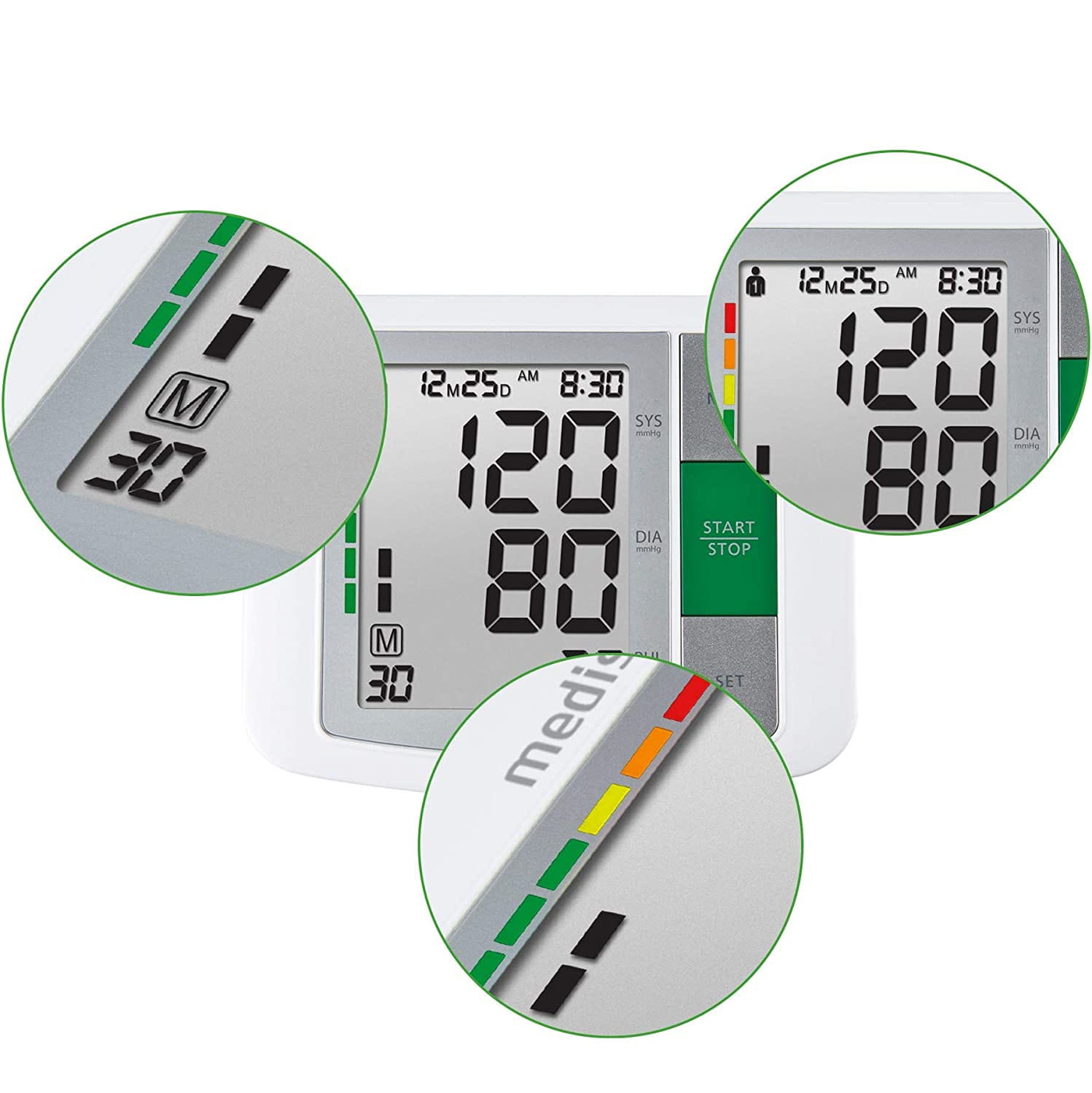 Duży, czytelny wyświetlacz LCD umożliwia łatwy odczyt wartości – nawet osobom starszym. Aparat mierzy ciśnienie skurczowe, rozkurczowe, tętno oraz automatycznie wykrywa arytmię serca. Wszystkie wyniki klasyfikowane są zgodnie z normami WHO (Światowej Organizacji Zdrowia) przy pomocy kolorowej skali.