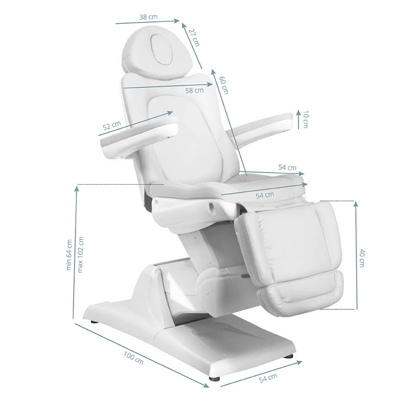Nowoczesny fotel kosmetyczny regulowany elektrycznie, zapewniający komfort podczas zabiegu nie tylko pacjentom, ale i osobom wykonującym zabieg. Ciche silniki elektryczne umożliwiające szybką i wygodną regulację fotela. Fotele mają wyprofilowane i bardzo wygodne siedzisko, są wytrzymałe oraz bardzo stabilne. Dzięki podnoszonym podłokietnikom łatwiej klientowi zając miejsce na fotelu. Szeroki zakres regulacji góra-dół pozwalający na indywidualne dostosowanie wysokości fotela do wzrostu osoby wykonującej zabieg oraz radzaju zabiegu.