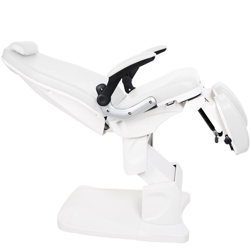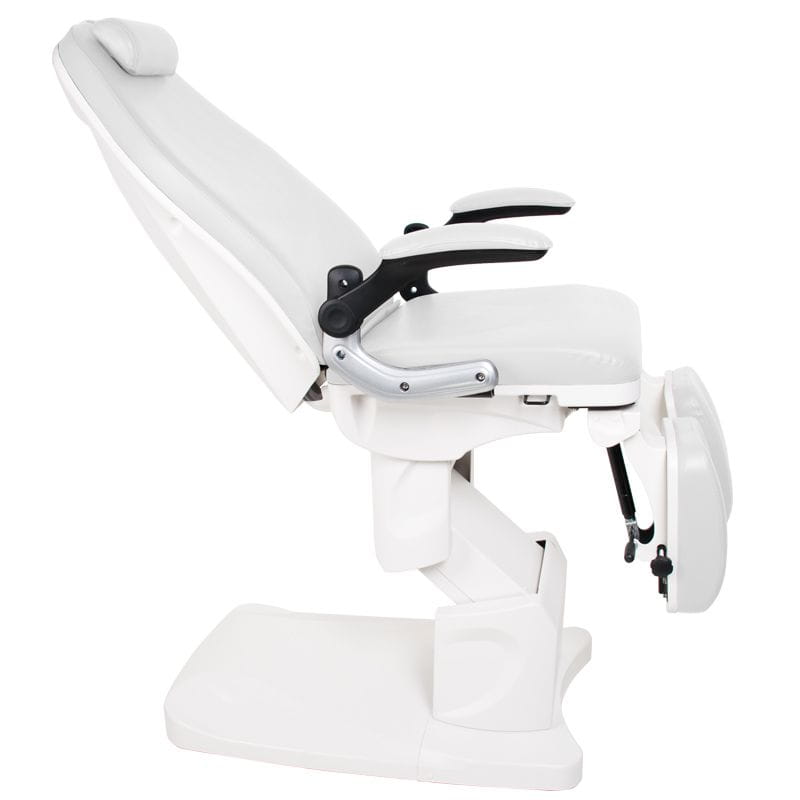 Nowoczesny fotel kosmetyczny, zapewniający komfort podczas zabiegu nie tylko pacjentom, ale i osobom wykonującym zabieg. Idealny do gabinetów podologicznych .Wyposażony w silniki elektryczne umożliwiające szybką i wygodną regulację fotela. Podnóżki rozsuwane na boki pod kątem 90°. Fotele są wytrzymałe i bardzo stabilne. Dzięki podnoszonym podłokietnikom łatwiej usiąść klientowi na siedzisku. Regulacja podnóżków pozwala dodatkowo doregulować fotel do indywidualnych potrzeb. Tapicerka z wysokiej jakoś ekoskóry. Fotele dostępne w szerokiej gamie kolorystycznej. Nowoczesny design i funkcjonalność w jednym. Na zdjęciu widoczny model w odcieniu białego.