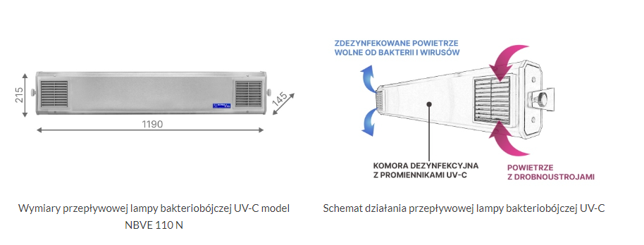 *Promieniowanie UV-C nieodwracalnie dezaktywuje bakterie, wirusy, pleśnie, grzyby oraz wszelkie inne drobnoustroje gdy tylko powyższe znajdują się w zasięgu promieni emitowanych przez lampy bezpośredniego działania i w komorze dezynfekcyjnej w przypadku lamp przepływowych z wymuszonym obiegiem powietrza.