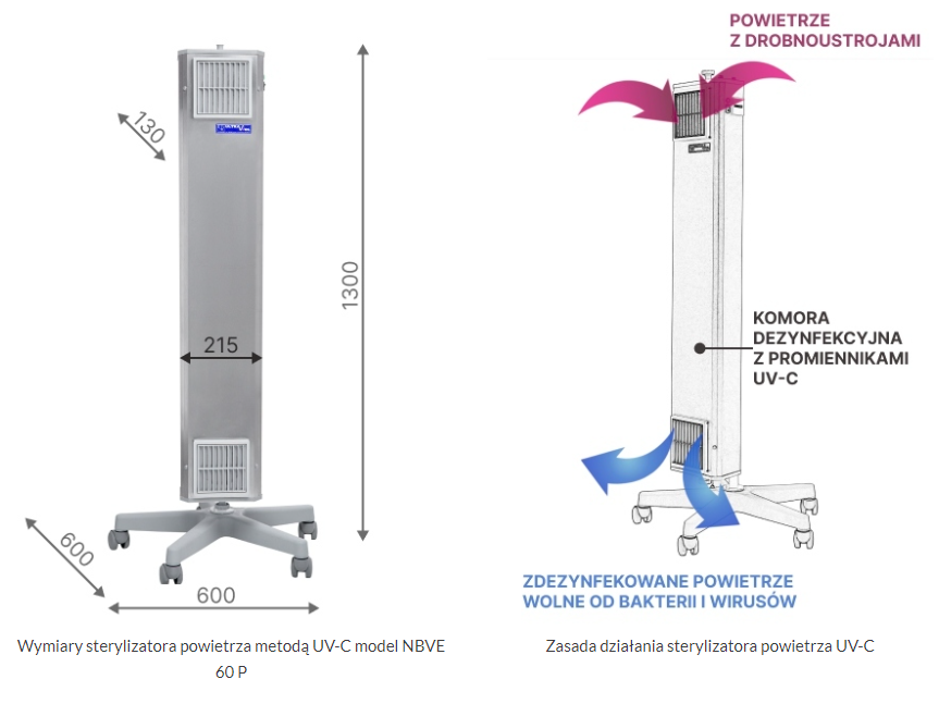 *Promieniowanie UV-C nieodwracalnie dezaktywuje bakterie, wirusy, pleśnie, grzyby oraz wszelkie inne drobnoustroje gdy tylko powyższe znajdują się w zasięgu promieni emitowanych przez lampy bezpośredniego działania i w komorze dezynfekcyjnej w przypadku lamp przepływowych z wymuszonym obiegiem powietrza.