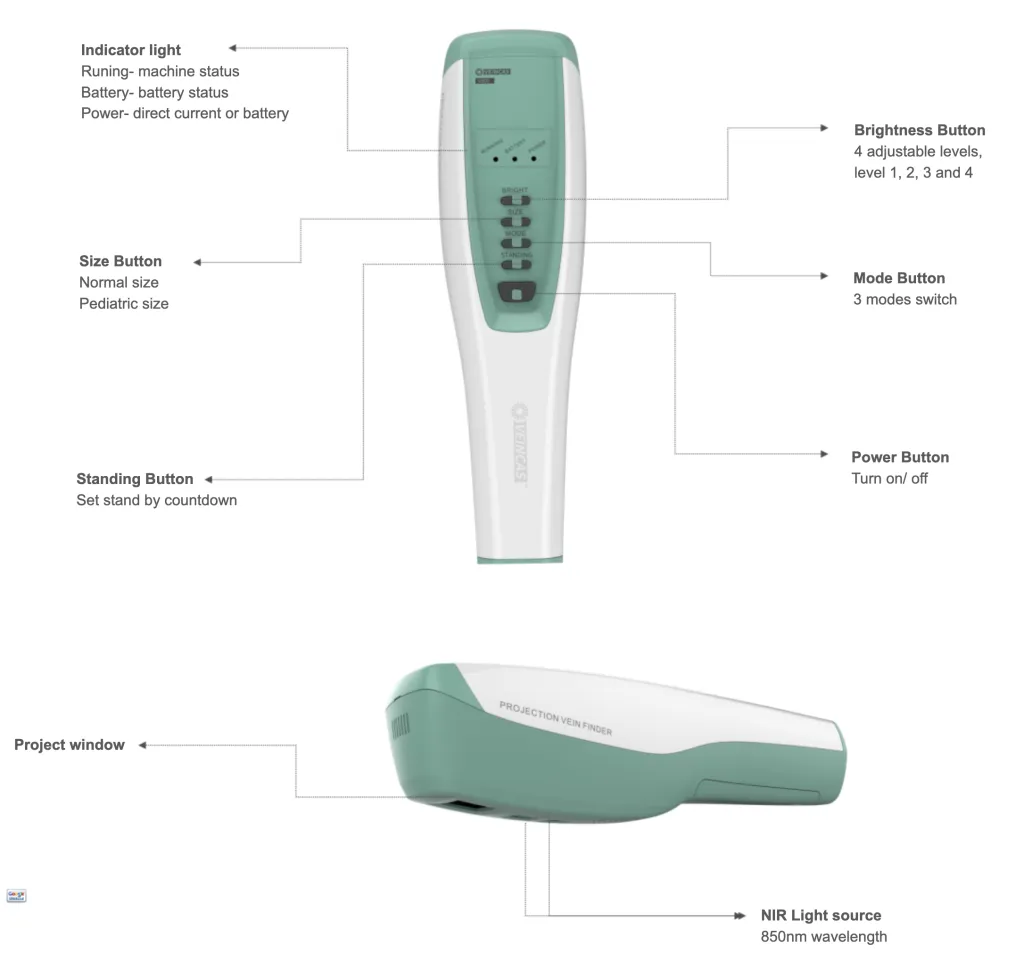 Vivolight V800F wykorzystuje światło bliskiej podczerwieni (NIR), które pozwala na wyraźne uwidocznienie naczyń krwionośnych dokładnie w miejscu planowanego wkłucia. Obraz żył jest rzutowany na powierzchnię skóry w sposób bezdotykowy.