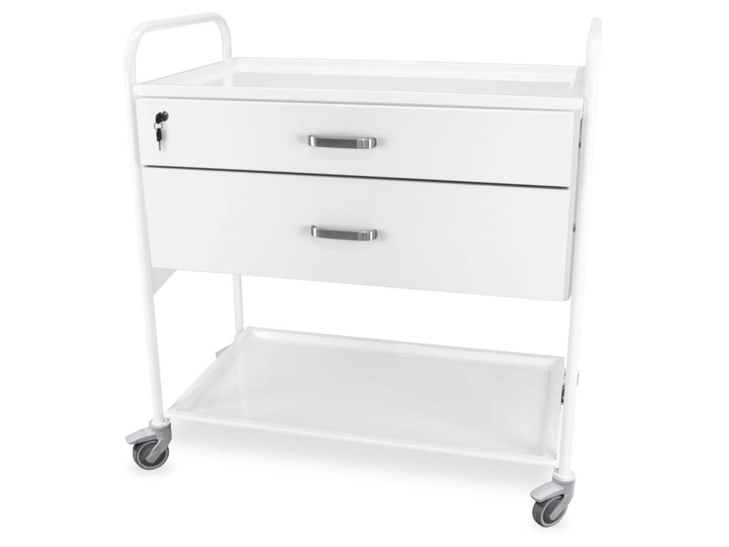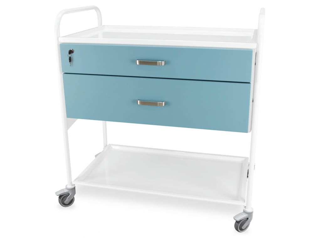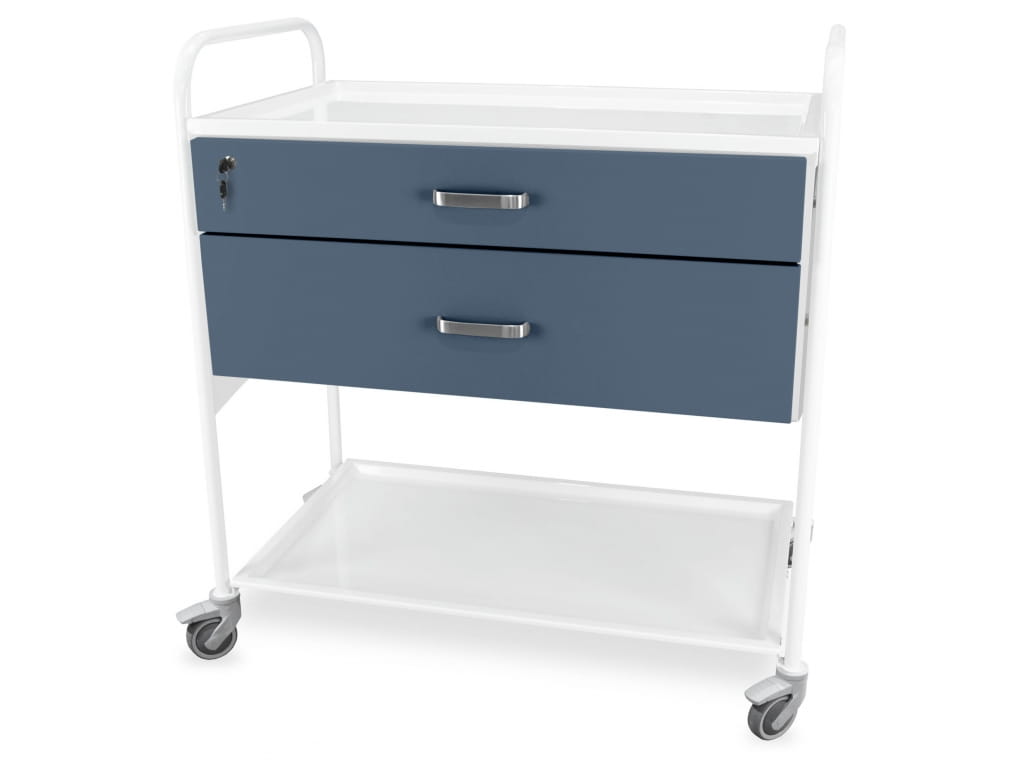 Szuflady wózka są wyłożone matą antypoślizgową. Standardowo szuflady górne posiadają zamek. Szynowy system po obu stronach wózka daje możliwość montowania dodatkowego wyposażenia na jednej z czterech szyn.