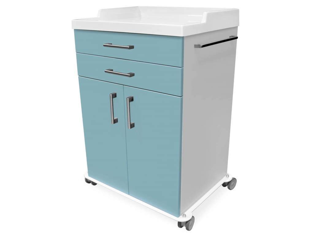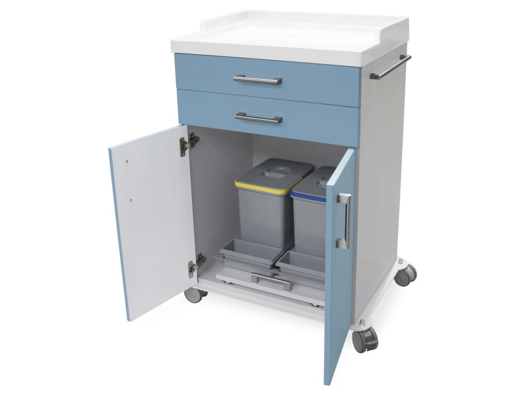 Zestaw służący jako wózek wielofunkcyjny przeznaczony do bezpiecznego i wygodnego transportowania różnego rodzaju urządzeń i materiałów mających zastosowanie w oddziałach szpitalnych. Posiada tacę zaprojektowaną z laminatu poliestrowo-szklanego. Jego korpus zaś jest wykonany z płyty wiórowej, natomiast front z płyty MDF. Całość została pokryta okleiną PCV. Wózek został osadzony na stalowej podstawie wyposażonej w kółka jezdne plus hamulec.
